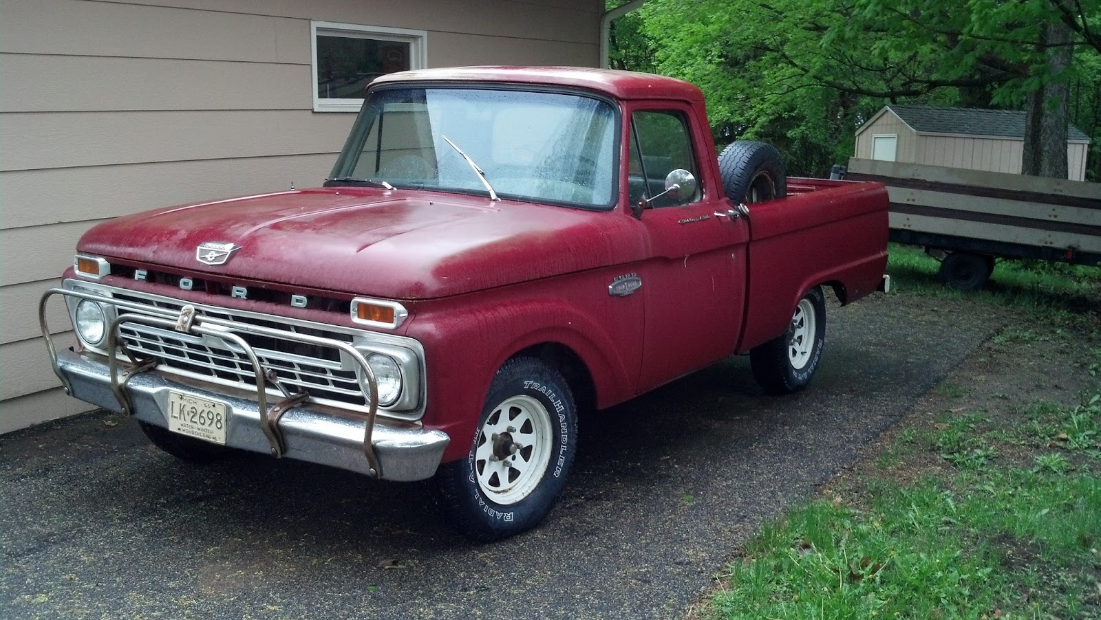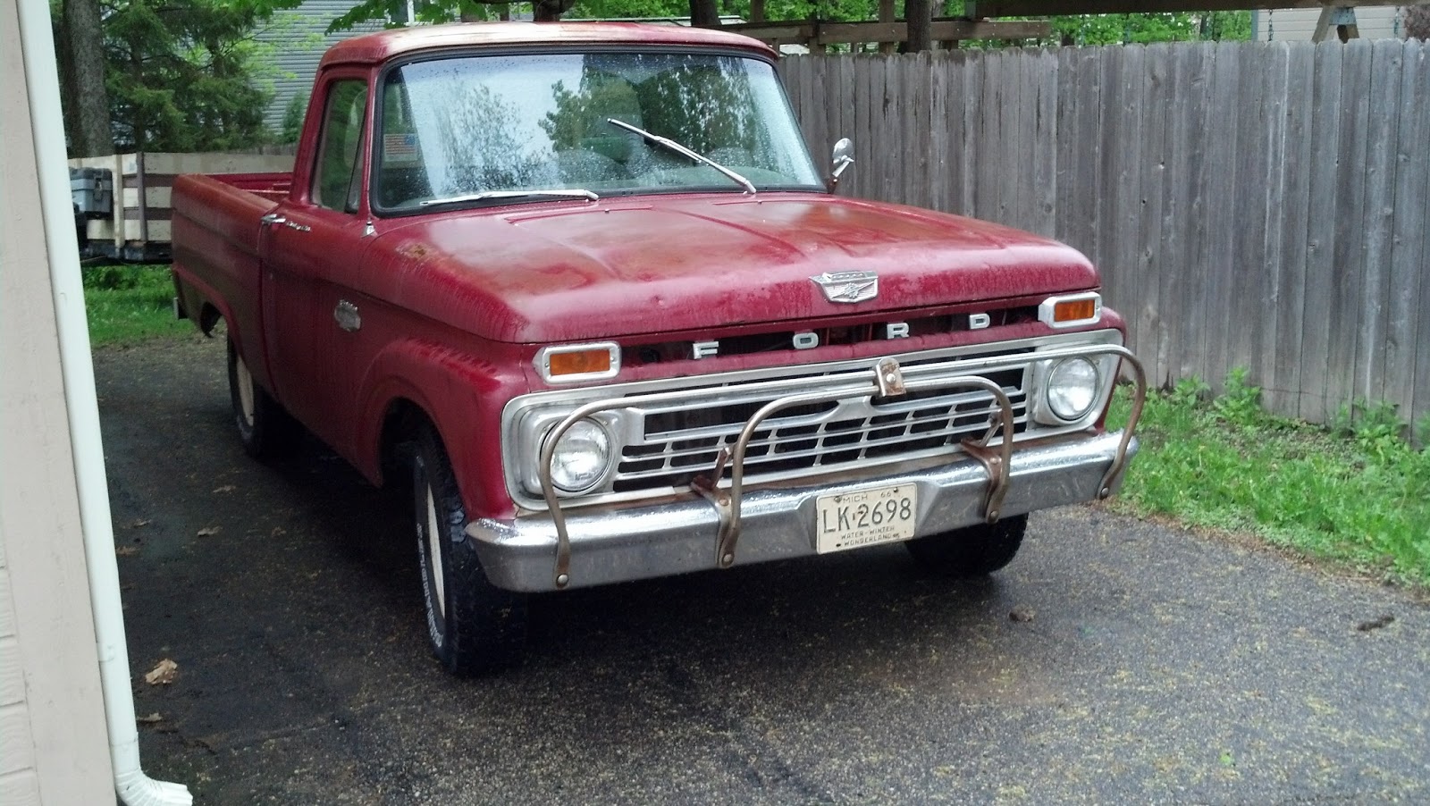 We found a ’66 Ford F-100 with a 240 straight six and three-on-the-tree — a ranch truck, “farm fresh” from Texas. The back bumper is heavy steel stamped with the dealer name: Kozelski Mtrs. West, Texas. The chrome brush guard on the front reads Smash Hit, Waco, Texas (with a lightning bolt between the Hs), and in the back window is a sunbleached sticker for 99.5 KBMA “La Fabulosa” Bryan-College Station. It had originally come to Michigan as a project truck for a father and son who had never quite gotten to it. The body and engine were solid, the electrical system and gauges were marginal, and the shift lever was inserted through a wallowed-out hole in the steering column and “secured” by a filed-down mini screwdriver that served as a pin. As you drove, the makeshift pin would sometime vibrate out, which led to a momentary thrill when the lever came off in your hand mid-shift.