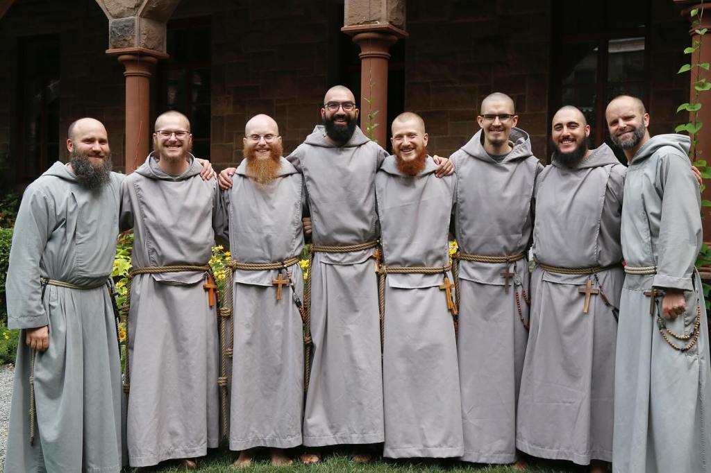 Photos courtesy of the Community of Franciscan Friars of the Renewal. In the group photo (left to right): Brother Kolbe (fully professed friar and maker of the habits, among other things); novices Brother Francis Immaculata of St. Louis (Ryan Box), Brother Anthony Solanus of Detroit (Jeremy Krygowski), Brother Ezekiel Thomas of Vienna (Joseph Dumais), Brother Barnabas Luke of Fowler (Brian Ambrustmacher), Brother Jude Apostoli of St. Michael (Gabriel Thorp), and Br. Martin Guadalupe of Camarillo (Christian Apodoca); and Father Innocent (fully professed friar, priest, and postulant master).