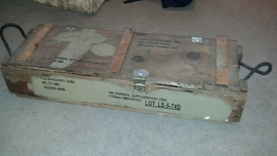Brendan and Gabe are active antique shoppers, and prefer to have money in their pocket when they step into a shop. Gabe likes religious artwork and books, vintage hats, and Coca-Cola memorabilia, while Bren looks for military surplus, historical books, manly artifacts like hunting and camping gear, and anything to do with Vernors ginger ale. Last weekend the three of us ventured out to give Brendan some driving practice in snow and traffic, and hit a military surplus store and three antique shops. Brendan spent $20 on an explosives crate, pictured above, to complement his military ammo box, and Gabe got a steal: a like-new copy of Our Daily Bread for a dollar and change. (Brendan drooled briefly over a signed ink sketch of Captain America knocking the heads of Hitler and Hirohito together, but decided that he didn’t have a couple hundred extra bucks.)
