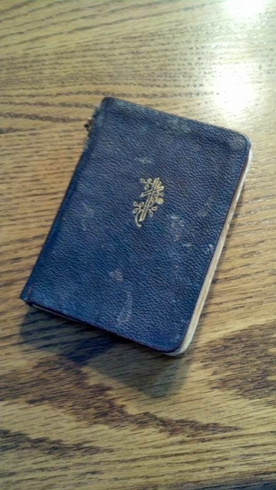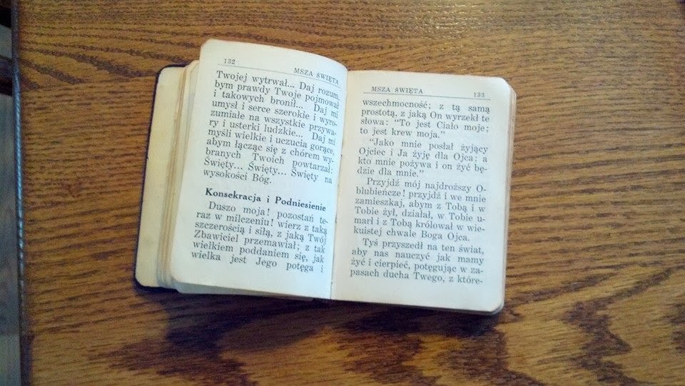 Both of these older boys show a nose for finding the right stuff and finding deals. Last spring, when Gabe and I brought Rosa (my old pickup) home from Michigan, we stopped at a junk shop in northern Wisconsin packed floor to ceiling with old stuff, new stuff, repurposed and recycled stuff — none of it marked. While the old fellow running the place made sporadic attempts to buy Rosa, Gabe nosed around the shelves of “smalls” and emerged with an inexpensive plaster-cast of the classic “praying hands” sculpture, a thimble-sized glass bottle of actual Coca-Cola, and a leather-bound Polish prayer book, pictured below. (Gabe knows how to say a few Polish words, but how he recognized this book as Polish, I don’t know.) He showed them to the old man, who was so intrigued by Gabe’s finds he charged him just a few dollars for the entire collection.