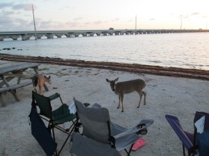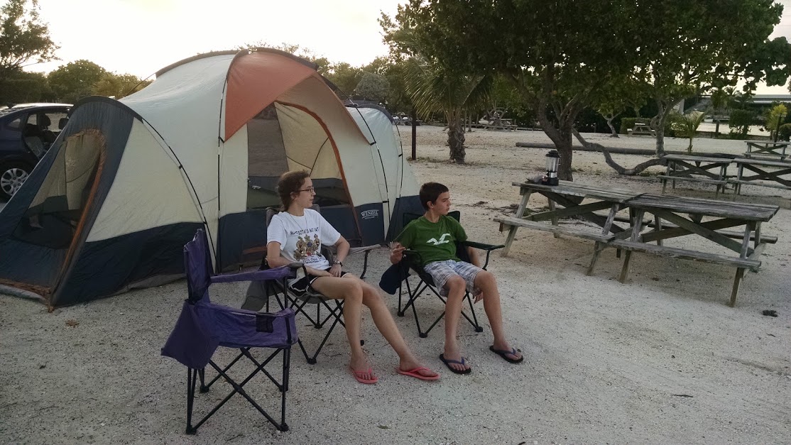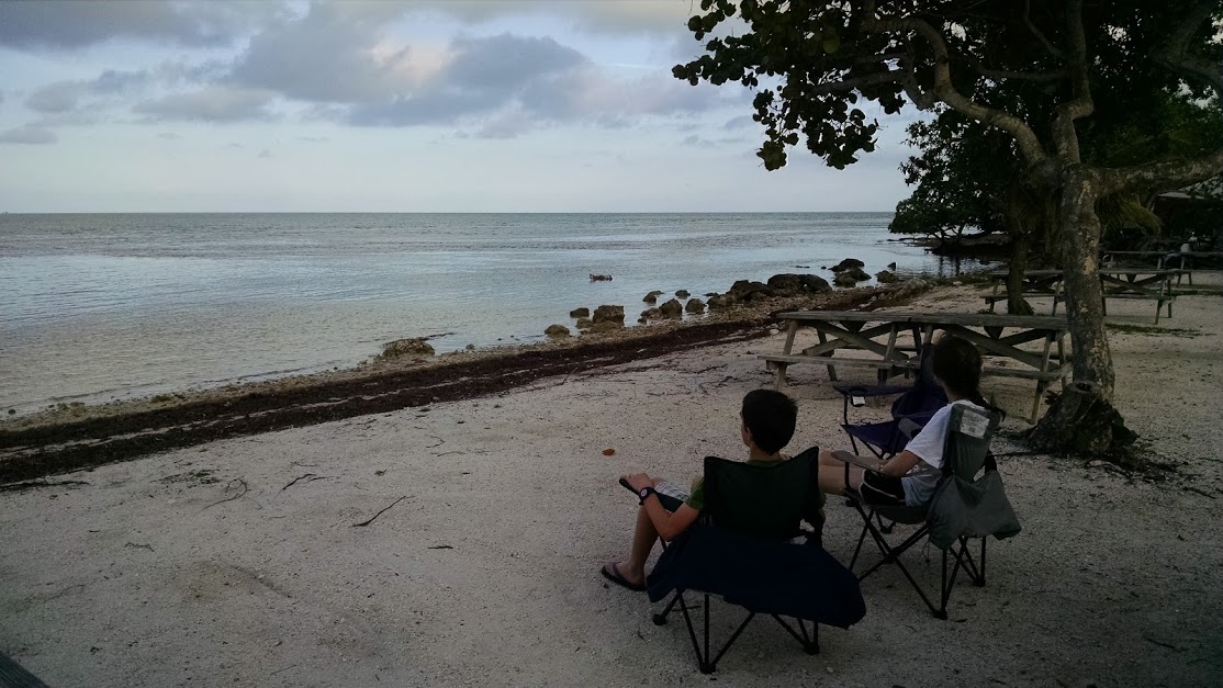 To save money, we spent our two nights in the Keys in a screen tent on the beach at Big Pine Key Fishing Lodge at Mile Marker 33 ($180 a night for a motel versus $50 for a tent). The weather was pleasant enough when we arrived Tuesday night, and we set up the tent in sunshine with a cooling breeze coming off the channel. We checked the weather forecast, and tossed the rain fly in the corner.